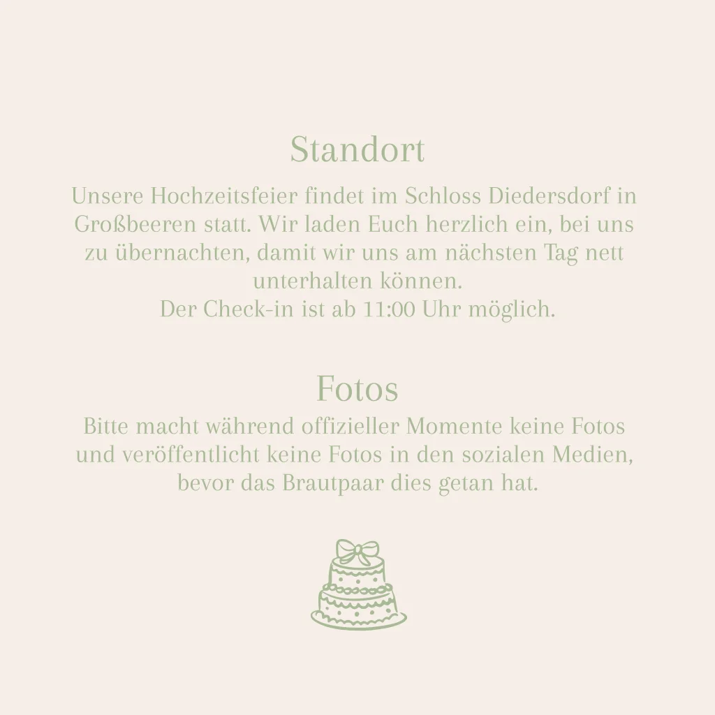 Extrakarte in beige mit grünen Elementen. Nutzt diese Zusatzkarte, um Euren Gästen weitere Informationen zu Ihrer Hochzeit zu geben.