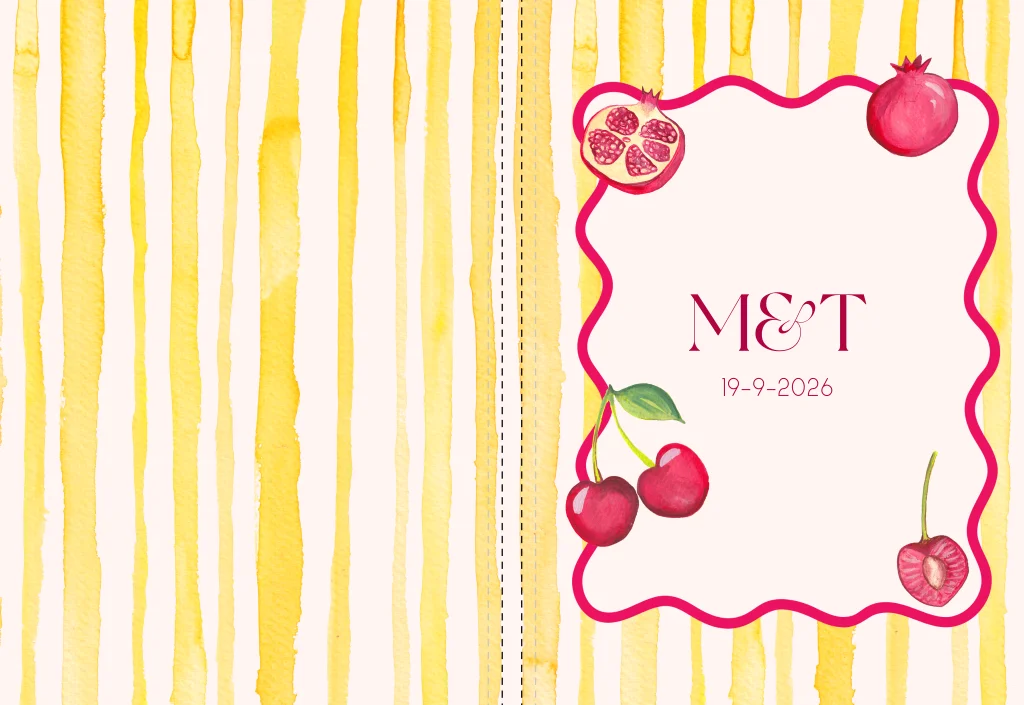 Trendy Gästebuch mit gelben Streifen und aufgemalten Kirschen und Granatäpfeln. Das Gästebuch zur Hochzeit ist eines der schönsten Erinnerungsstücke, die Ihr von Eurem großen Tag mitnehmen könnt.