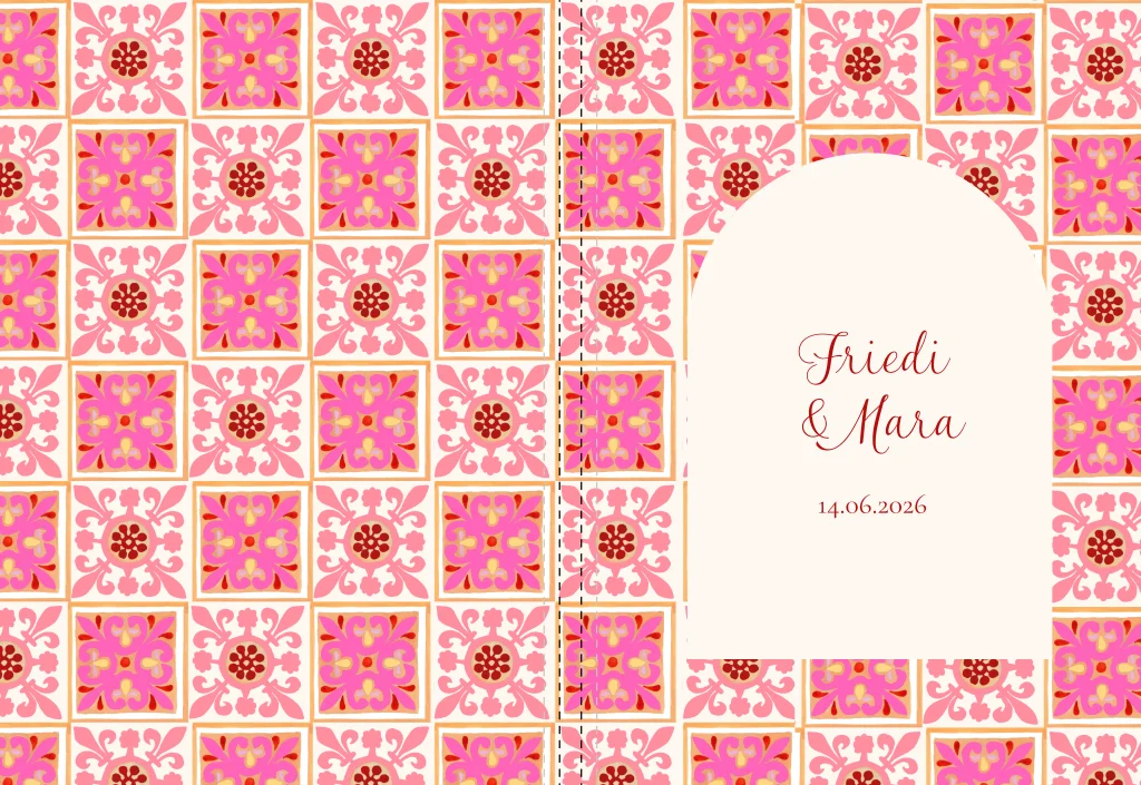 Ein farbenfrohes Gästebuch mit dem Druck von spanischen rosafarbenden Fliesen. Die Fliesen sind für einen authentischen Look mit Gouache bemalt.