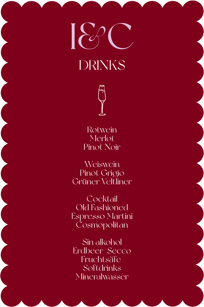 Informiert Eure Gäste mit dieser schönen Getränkekarte über die Getränke, die auf Eurer Hochzeit serviert werden.