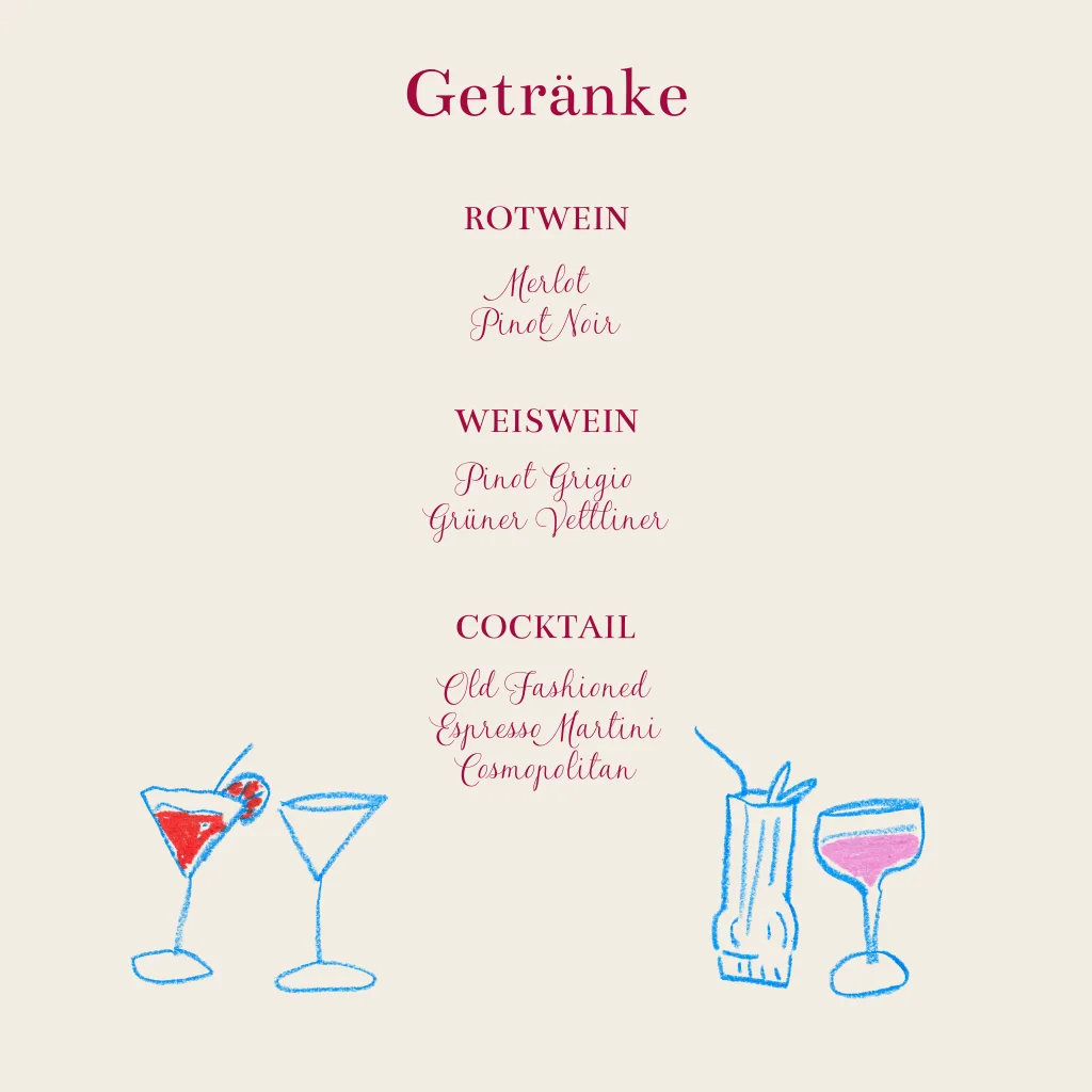 Getränkekarte mit verspielten, gezeichneten Getränken.