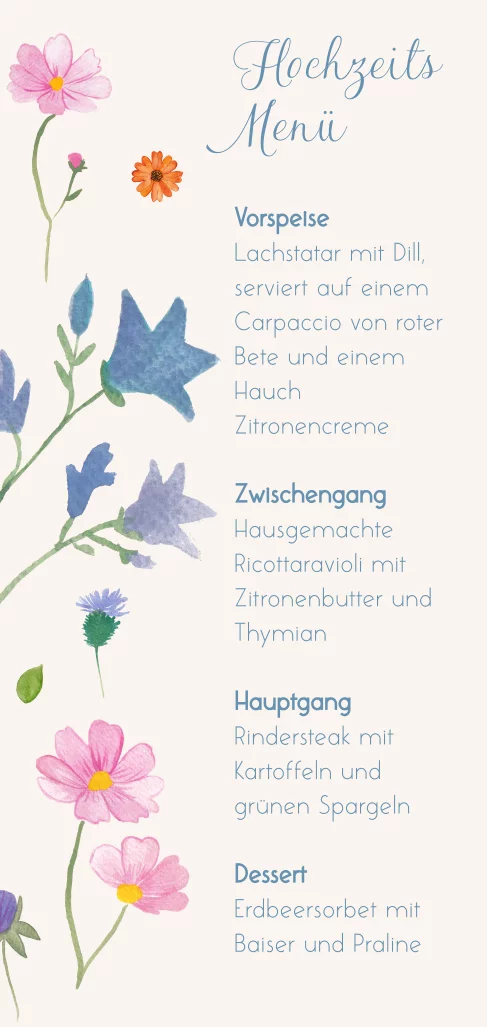 Vervollständigt Eure Tischdekoration mit dieser romantischen Menükarte mit gemalten Blumen in Aquarell.