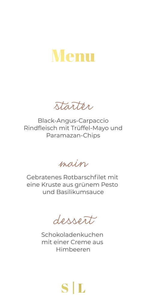 Mit Goldfolie veredelt passt diese Menükarte perfekt zu den anderen Designs der Kollektion. Schaut Euch, für ein stimmiges Gesamtbild, auch diese an.