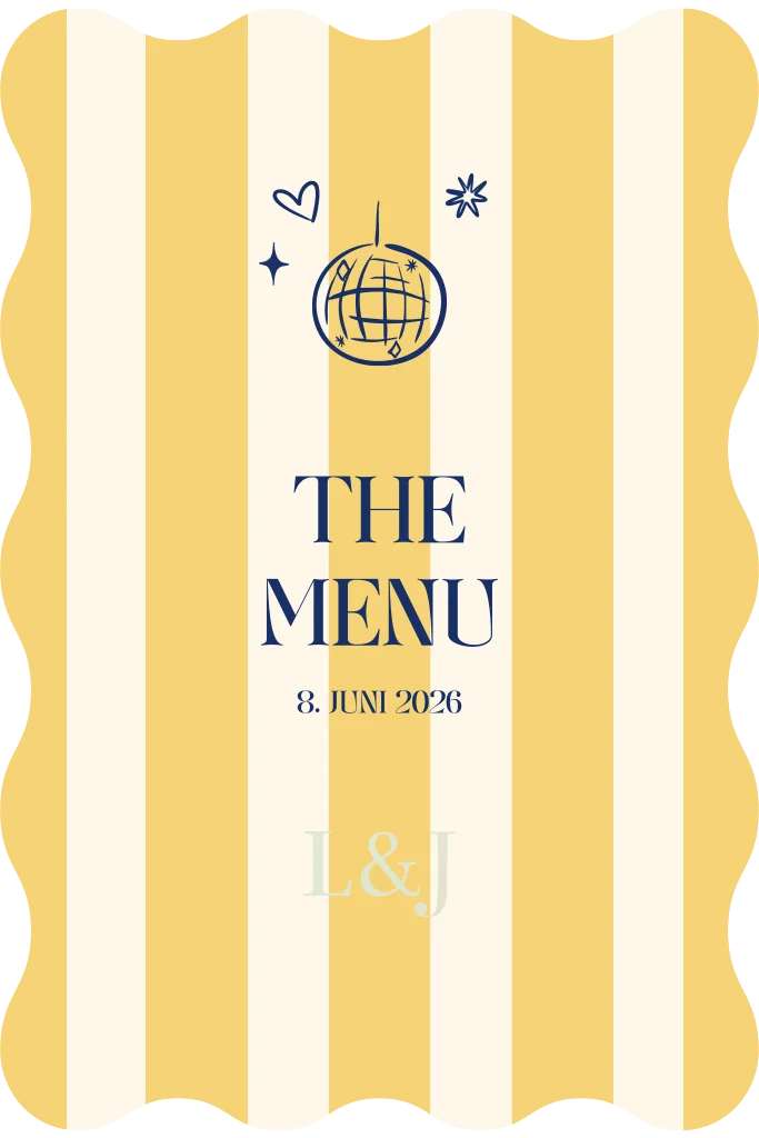 Vervollständigt Eure Tischdekoration mit dieser schönen Menükarte mit Gelbe Streifen und gewellter Rand.