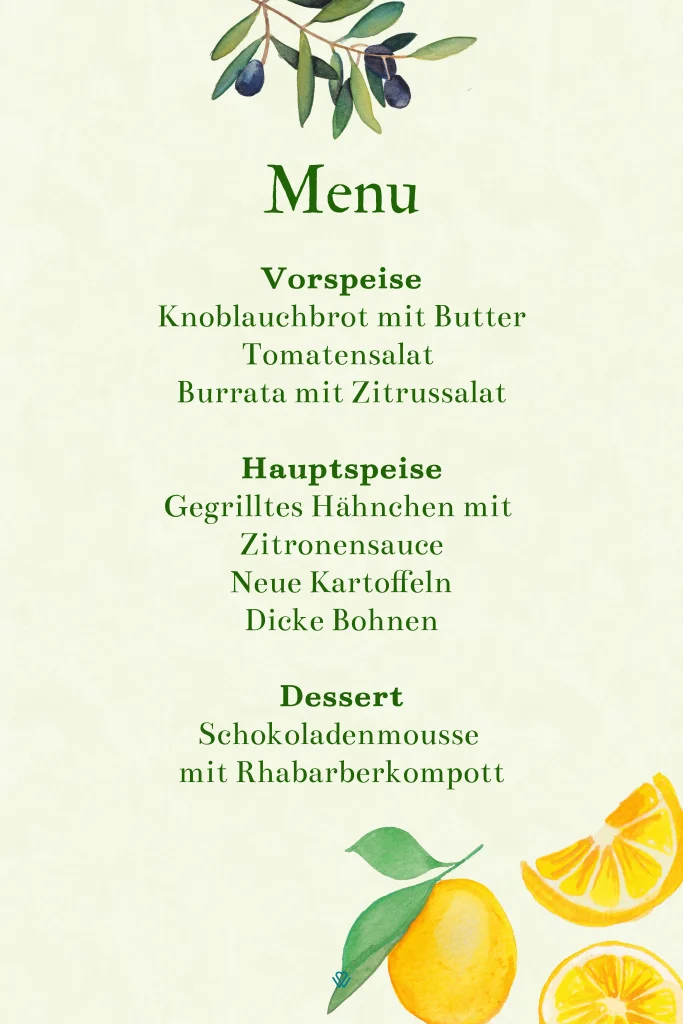 Wunderschöne Menükarte mit handgemalten Olivenzweigen und Zitronen.