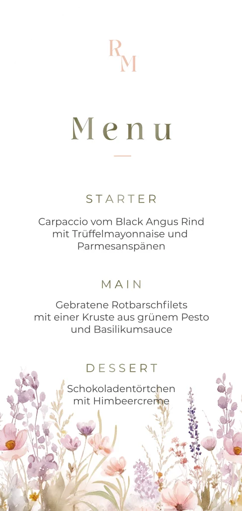Eine romantische Menükarte für Eure Hochzeit mit sanften Aquarell-Blumen, Euren Initialen und edlen Hochganz-Schriftzügen.