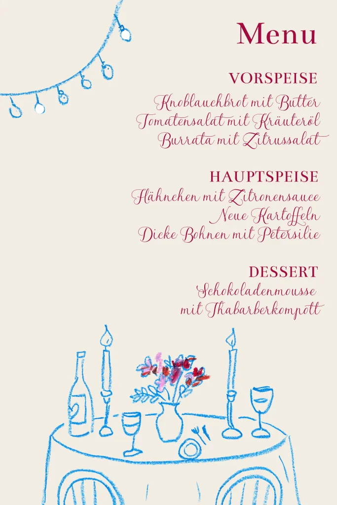 Menükarte mit gezeichnetem Tisch und anderen verspielten Hochzeitselementen.