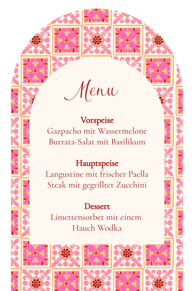 Die Menükarte ist mit rosafarbenen spanischen Kacheln bedruckt und eignet sich daher perfekt für eine Hochzeit im mediterranen Ambiente.