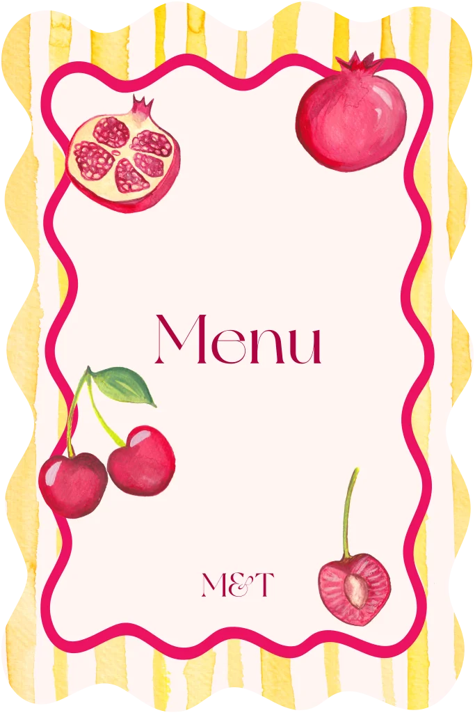 Trendy bunte Menükarte mit Streifen und bemalten Kirschen und Granatäpfeln.