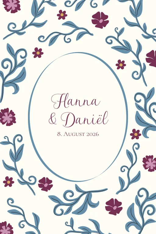 Stilvolles Willkommensschild mit floralem Muster in blau und lila.