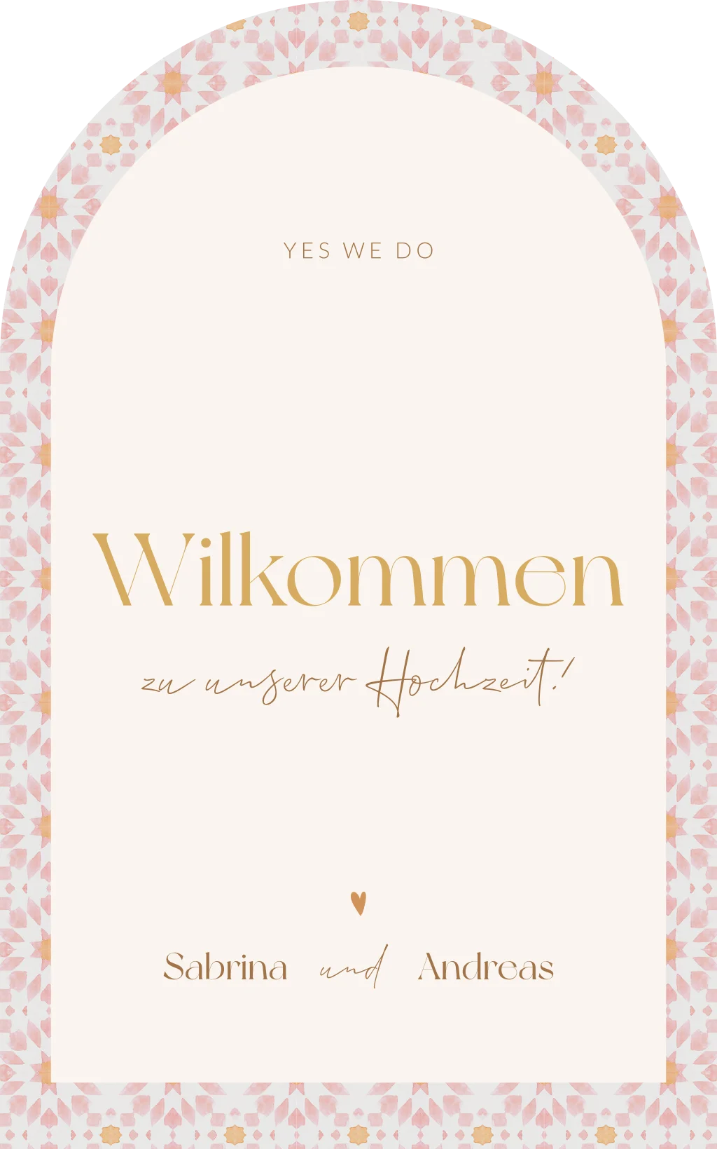 Originelles Willkommensschild für eine Hochzeit im mediterranen Stil. Das Willkommensschild hat die Form eines Bogens.