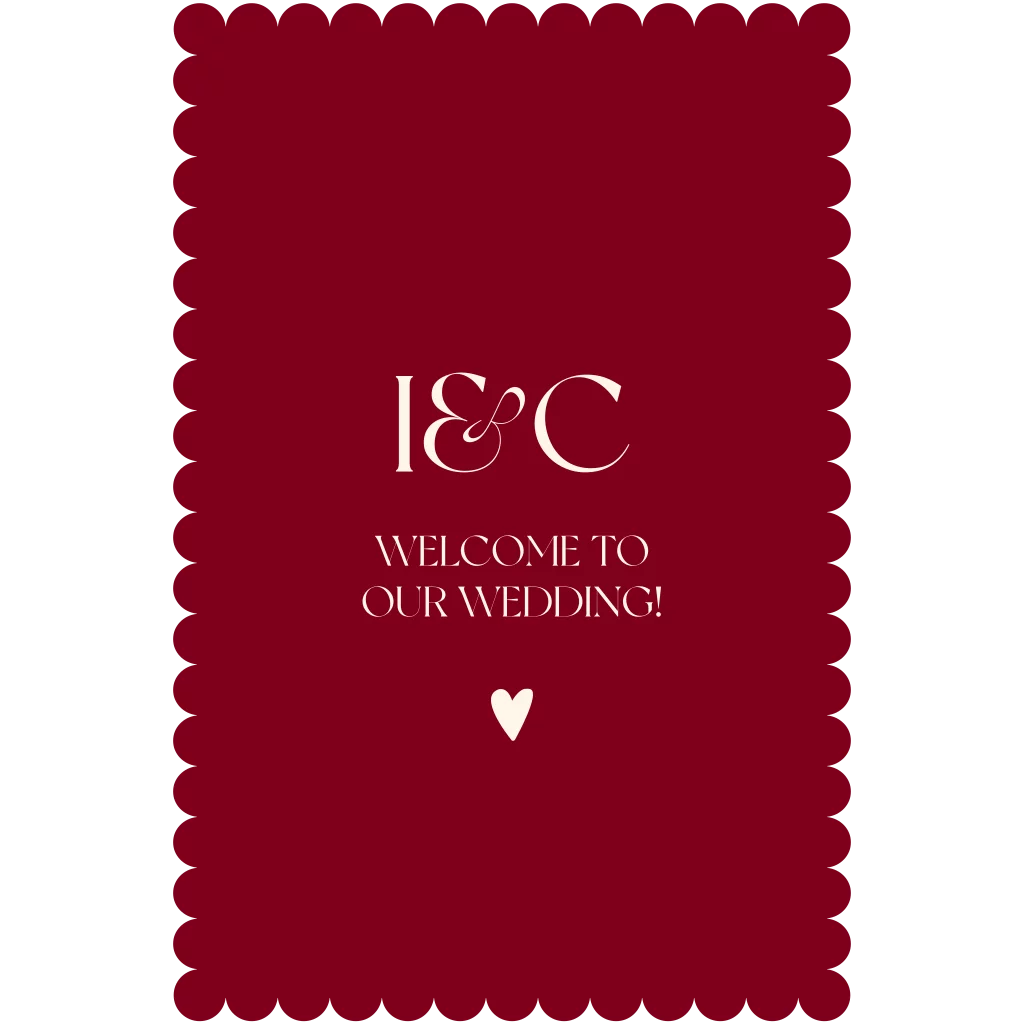 Stilvolles Willkommensschild in Burgunderrot mit trendy gepunktetem Rand.