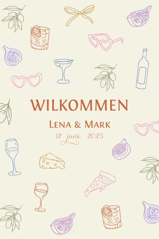 Hippes Willkommensschild mit gezeichneten Feigen und weiteren Motiven wie Pizzastück, Cocktailglas, Herz-Sonnenbrille, Käse und Oliven.