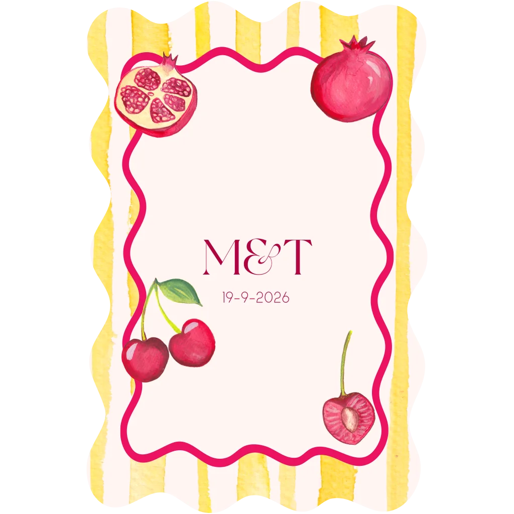 Trendy, farbenfrohes Willkommensschild mit gelben Streifen und aufgemalten Kirschen und Granatäpfeln.