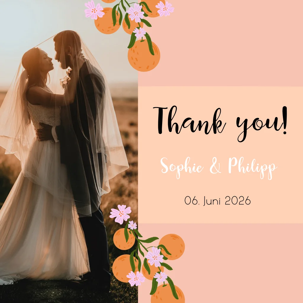 Auf dieser Dankeskarte verbinden sich sanfte Orangetöne und rosige Blüten zu einem warmen, mediterranen Flair.