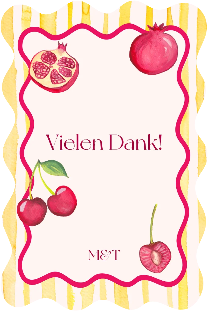 Trendy bunte Dankeskarte mit gelben Streifen und aufgemalten Kirschen und Granatäpfeln.