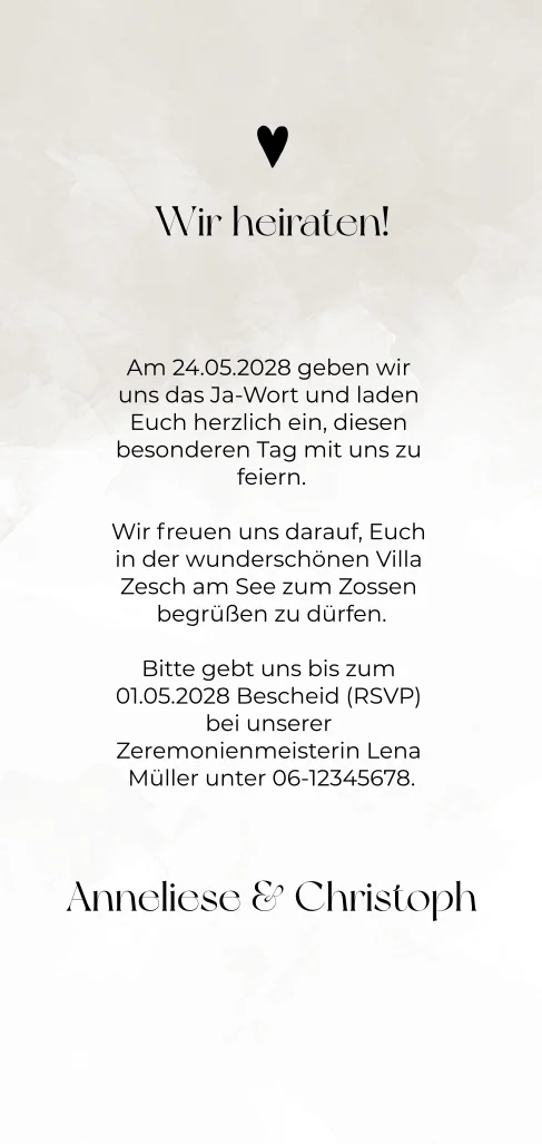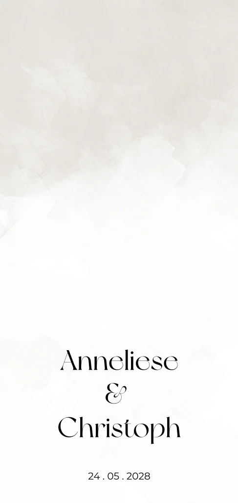 Die subtile künstlerische Textur und die klare, leserliche Typografie lassen eure Namen und das Hochzeitsdatum perfekt zur Geltung kommen. Diese Karte ist ideal für eine stilvolle und dezente Hochzeit. Personalisiert sie ganz nach euren Wünschen mit euren Daten und kreiert so eine einzigartige Einladung, die den Ton für euren besonderen Tag angibt.