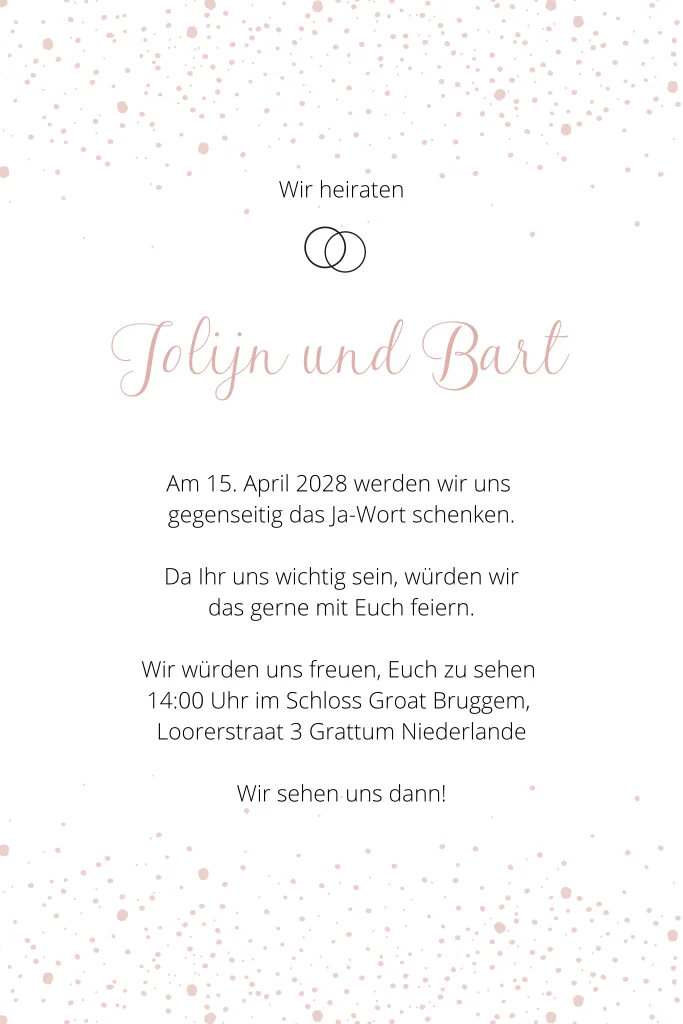 Die subtilen, aber funkelnden Goldfolien-Sprenkel verleihen der Karte eine festliche und luxuriöse Ausstrahlung, wie ein Regen aus Konfetti an Eurem besonderen Tag. Mit ihrem zeitgemäßen Design und den sanft abgerundeten Ecken bietet diese Karte die perfekte Basis, um Eure Geschichte zu erzählen.