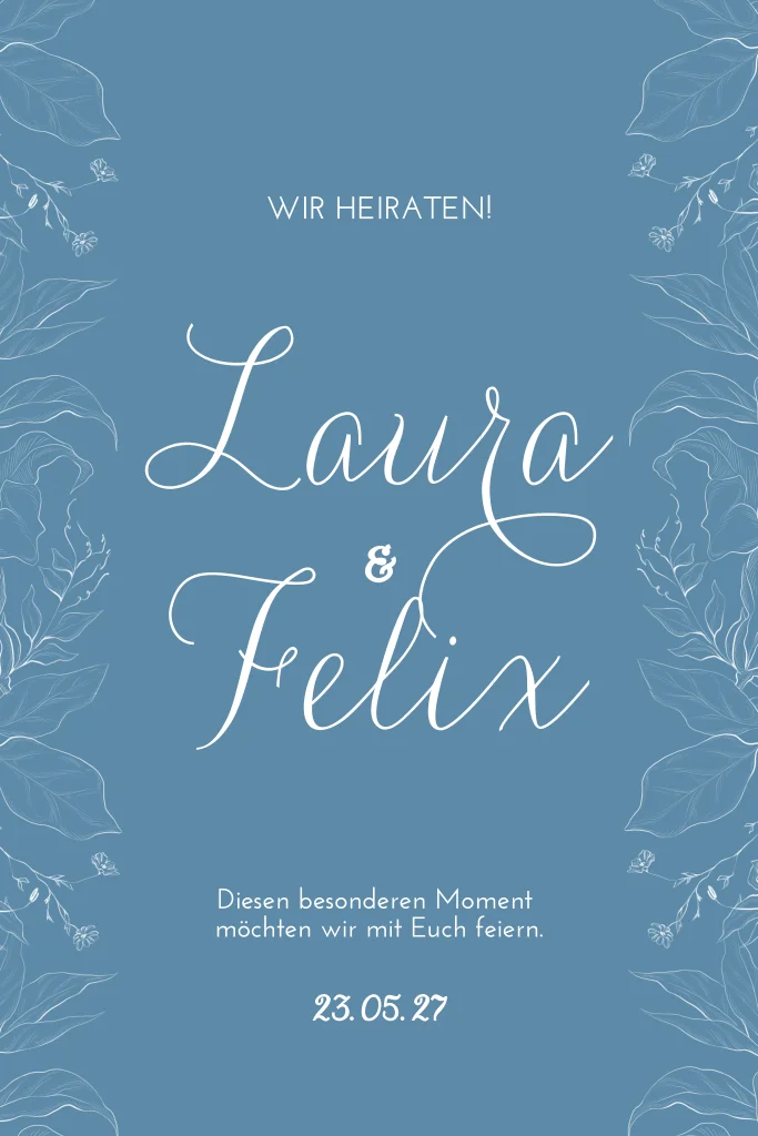 Eine wunderschöne blaue Einladungskarte mit sanften weißen Blumen und Foto.