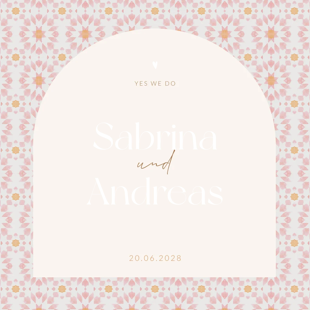 Luxuriöse Hochzeitseinladung mit einem schönen rosa, mediterranen Muster.