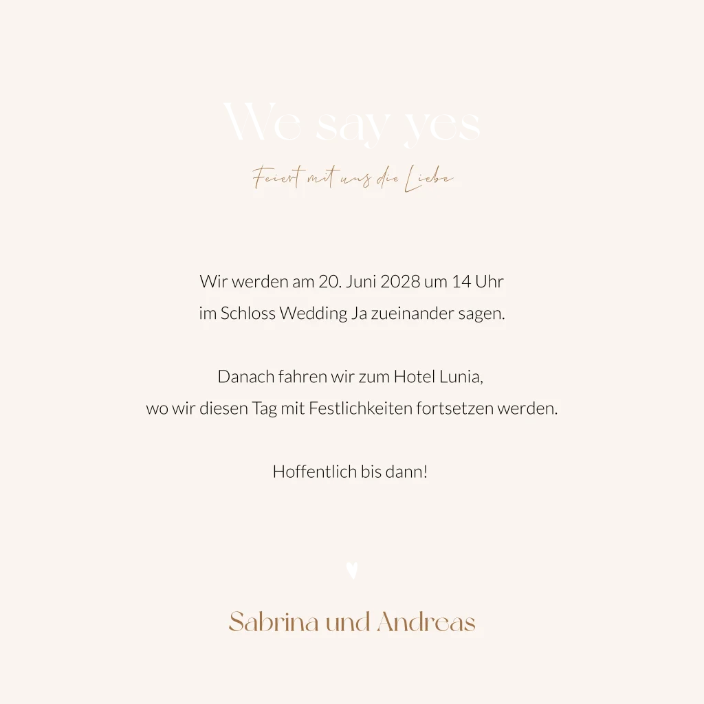 In der Bogenform steht der Text „Yes We Do“ mit den Namen des Brautpaares in wunderschön glänzender Goldfolie.