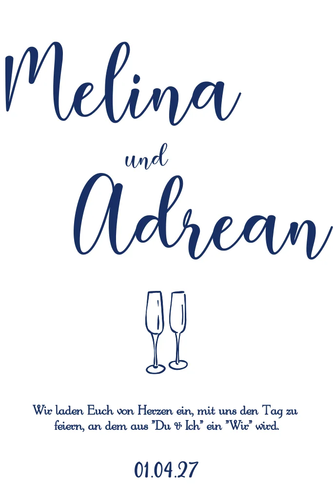 Diese elegante Einladungskarte mit gezeichneten dunkelblauen Sektgläsern lässt sich ganz nach Euren Wünschen im Editor anpassen.