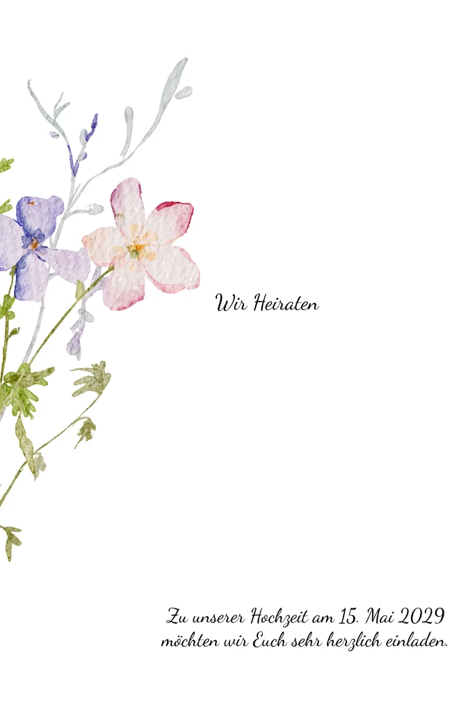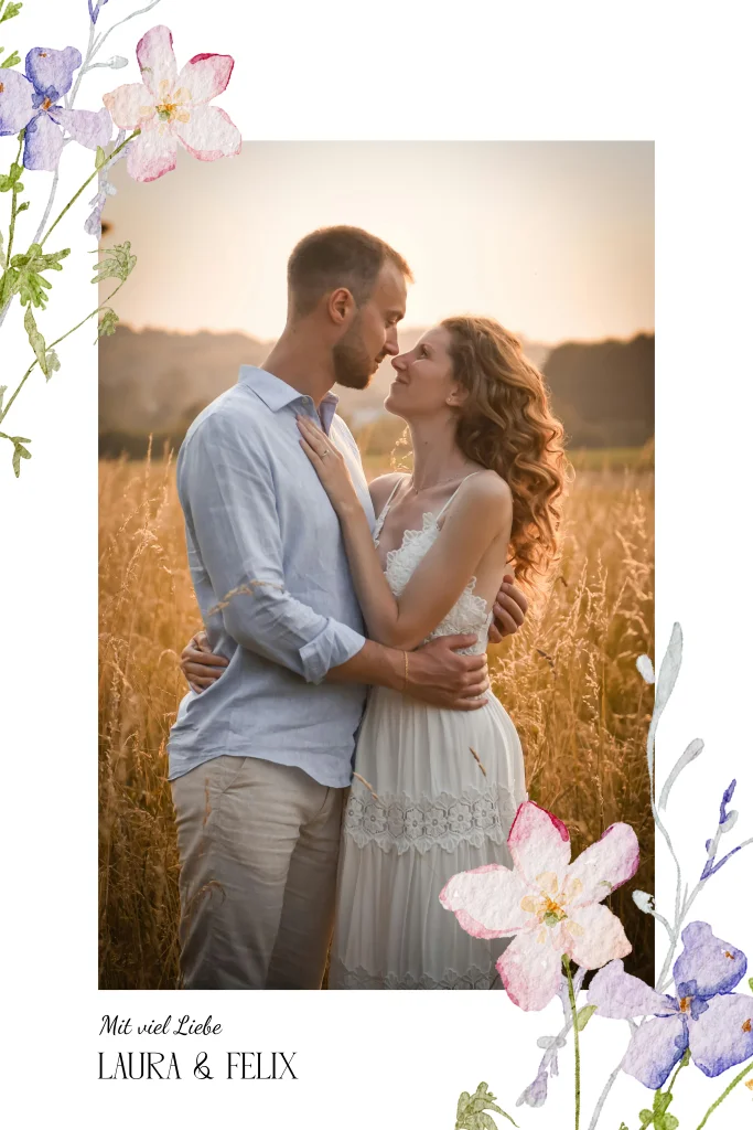 Eine romantische Einladungskarte mit Wildblumen, Platz für ein Foto und edler Silberfolie.