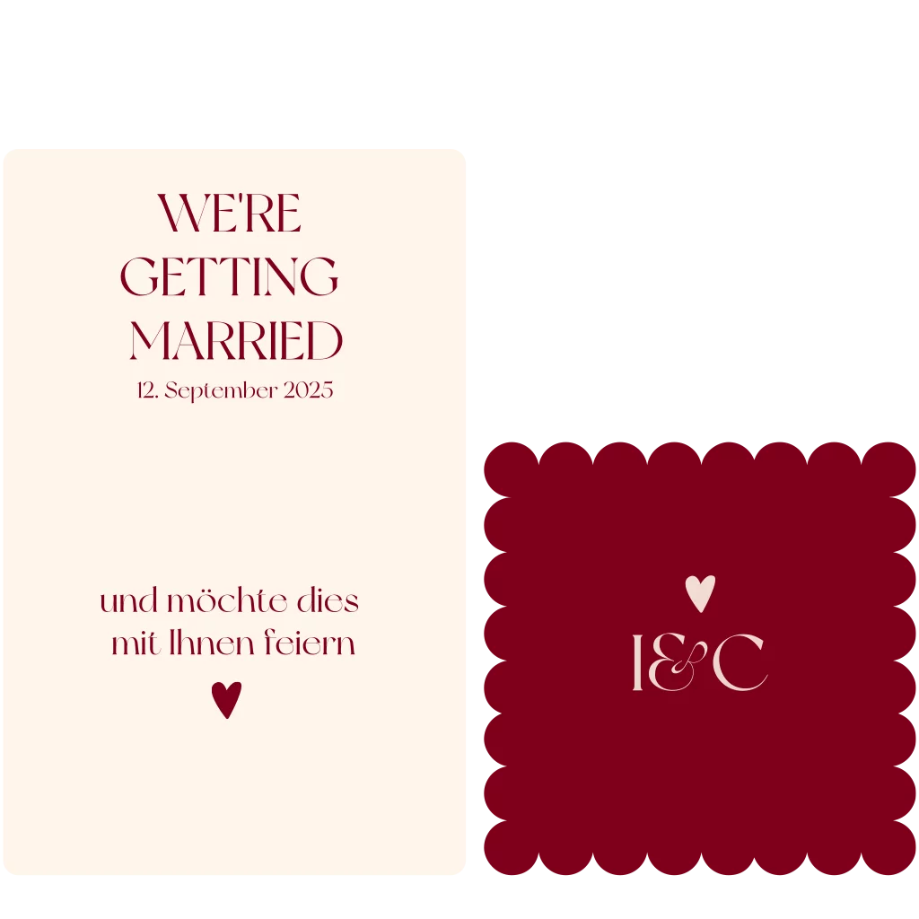 Originelle Hochzeitseinladung. Die gestapelte Karte mit gepunktetem Rand in einem schönen burgunderrot enthält verspielte Hochzeitszeichnungen um Euer Programm zu präsentieren.