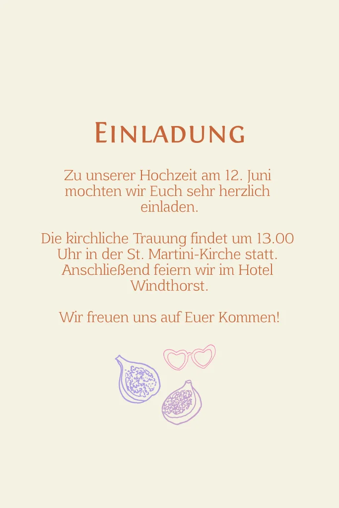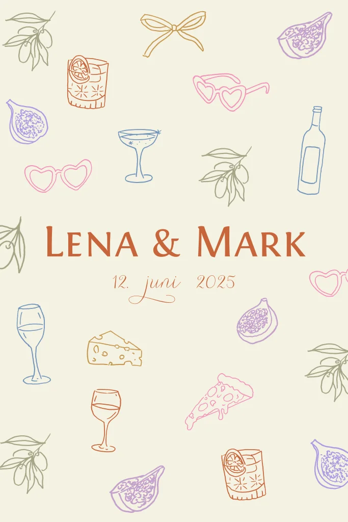Trendy Hochzeitseinladung mit gezeichneten Feigen und anderen Zeichnungen wie einem Pizzastück, einem Cocktailglas, einer Herzsonnenbrille, Käse und Oliven.