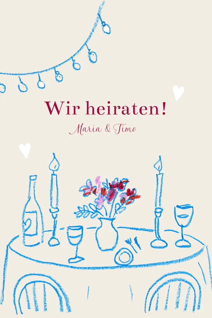 Einladung mit einem gezeichneten Tisch und weiteren verspielten Hochzeitselementen.