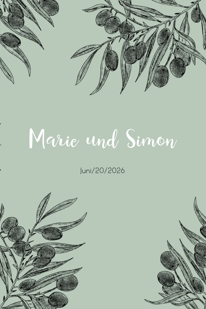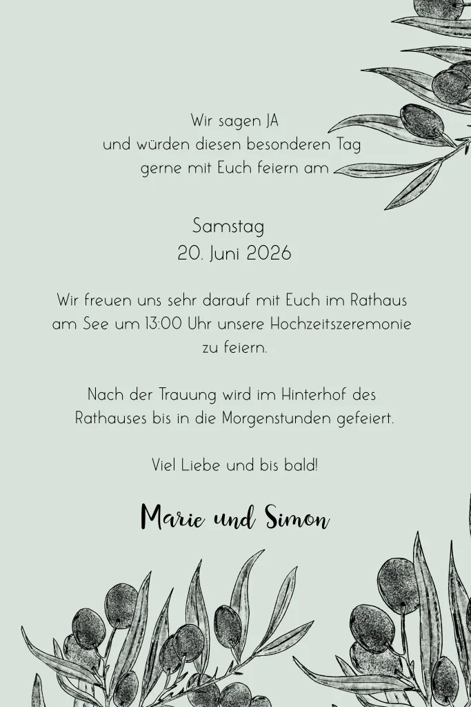 Diese elegante Hochzeitseinladung mit Olivenzweigen in schlichtem Design versprüht eine natürliche, mediterrane Leichtigkeit und zeitlose Schönheit.