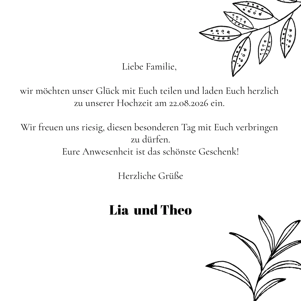 Zeitlose und elegante Hochzeitseinladung mit schlichter Romantik. Klare Typografie und dezente florale Akzente schaffen ein stilvolles Design, das persönlich wirkt, ohne überladen zu sein.