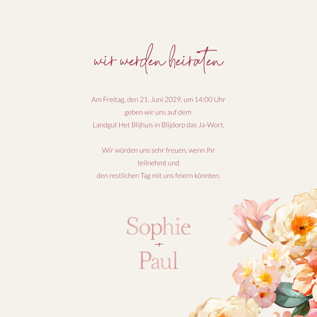 Mit unserem Online-Editor könnt Ihr die Karte ganz nach euren Wünschen anpassen. So entsteht eine Hochzeitseinladung, die perfekt zu Euch passt.