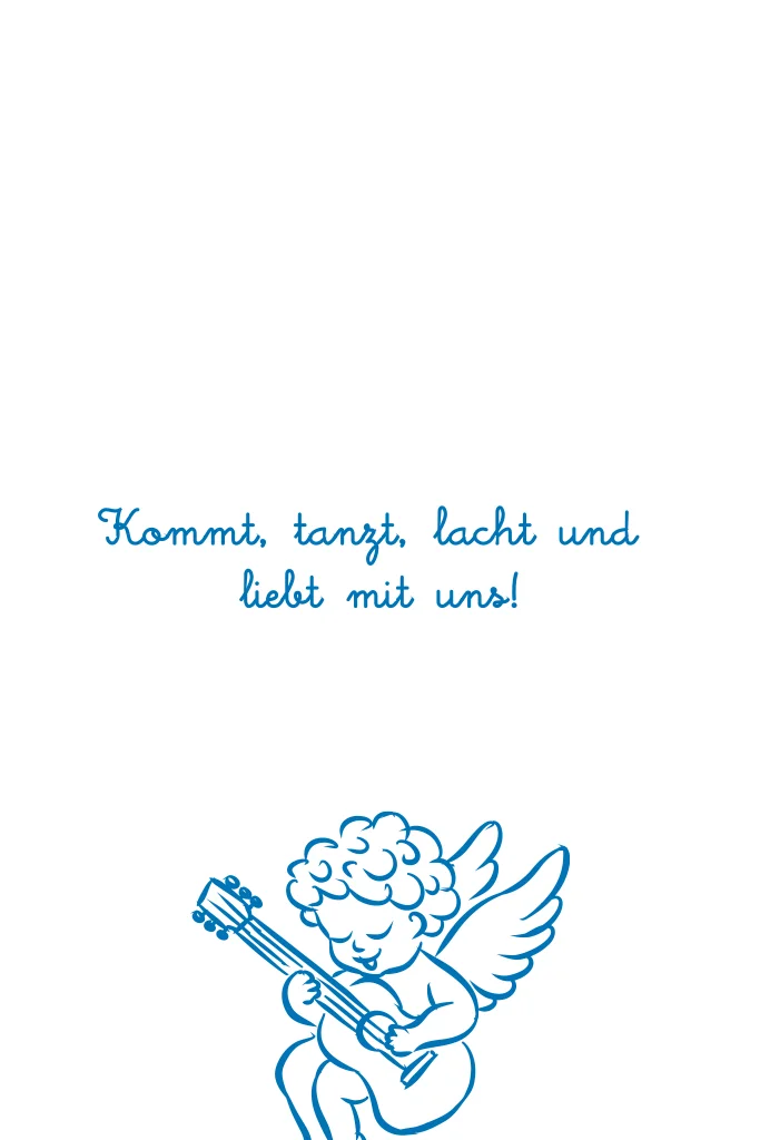 Eine verspielte Einladungskarte mit romantischen blauen Zeichnungen und Herzen.