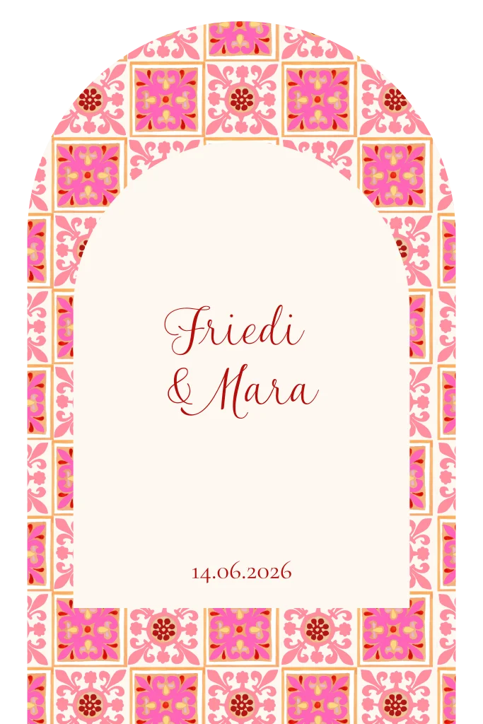 Trendige und farbenfrohe Hochzeitseinladung mit dem Druck von spanischen rosafarbenden Fliesen. Die Fliesen sind für einen authentischen Look mit Gouache bemalt. Schaut Euch auch die restlichen Hochzeitsdrucke aus dieser Kollektion an, damit an Eurem Hochzeitstag alles perfekt zusammenpasst!