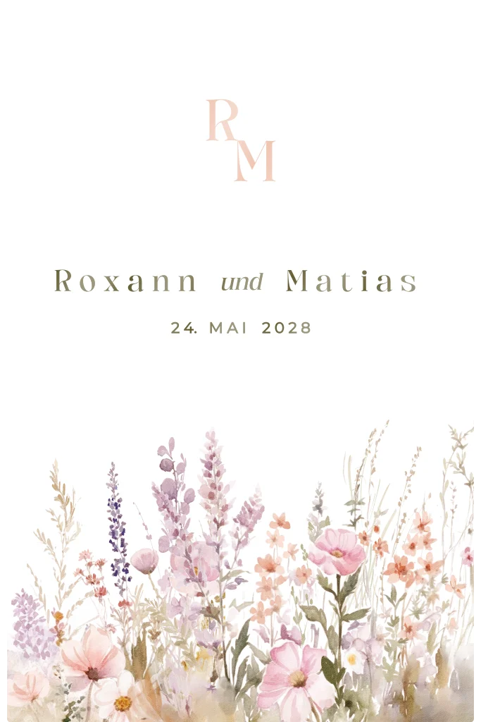 Romantische Einladungskarte für Eure Hochzeit mit sanften Aquarell-Blumen und edlen Hochglanz-Schriftzügen.
