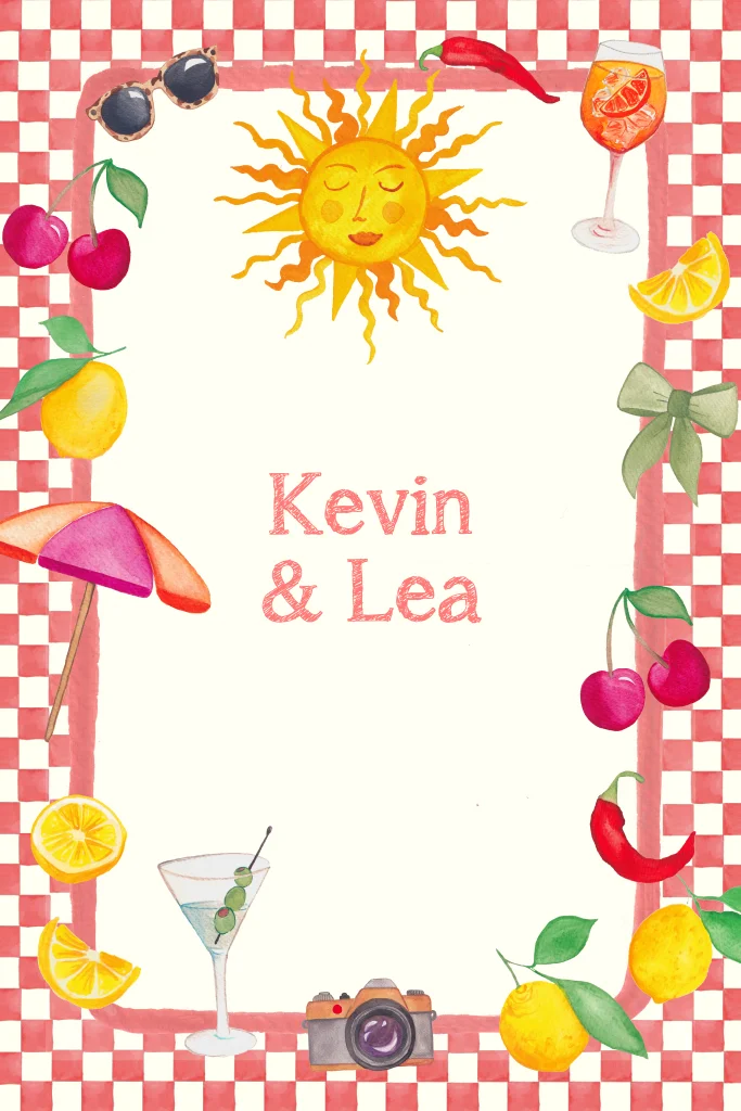 Trendige Hochzeitseinladung mit Karomuster und aufgemalten Elementen: Sonne, Aperolglas, Sonnenbrille, Zitronen und mehr.