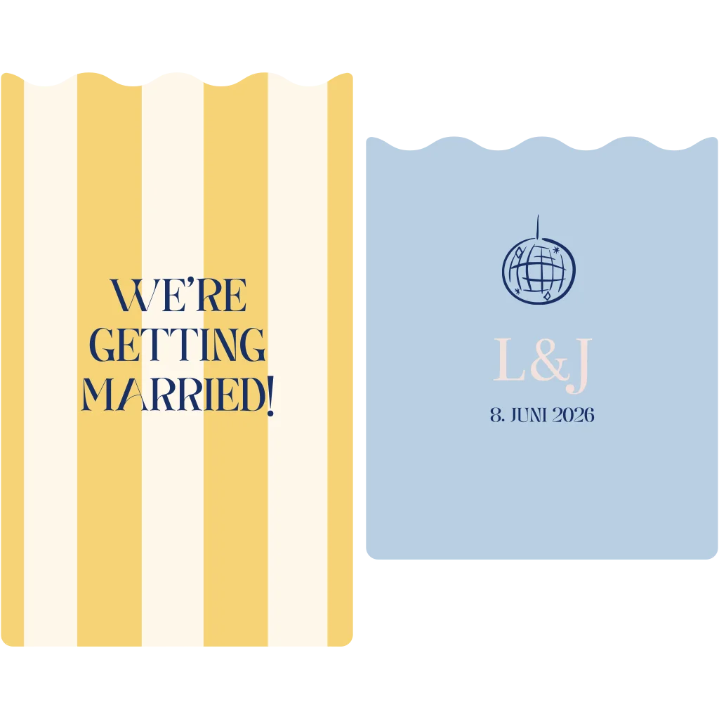 Trendy Hochzeitseinladung als Stapelkarte mit gelben Streifen und gewelltem Rand. Schaut Euch auch die restlichen Hochzeitsdrucke aus dieser Kollektion an, damit an Eurem Hochzeitstag alles perfekt zusammenpasst!