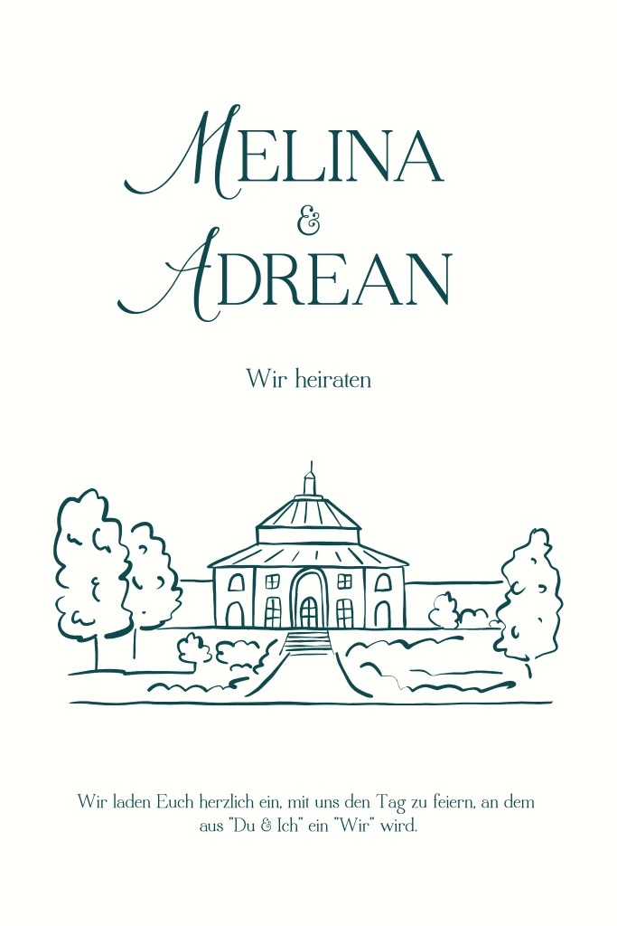 Minimalistische Einladungskarte mit dunkeltürkisen Zeichnungen und Designs.