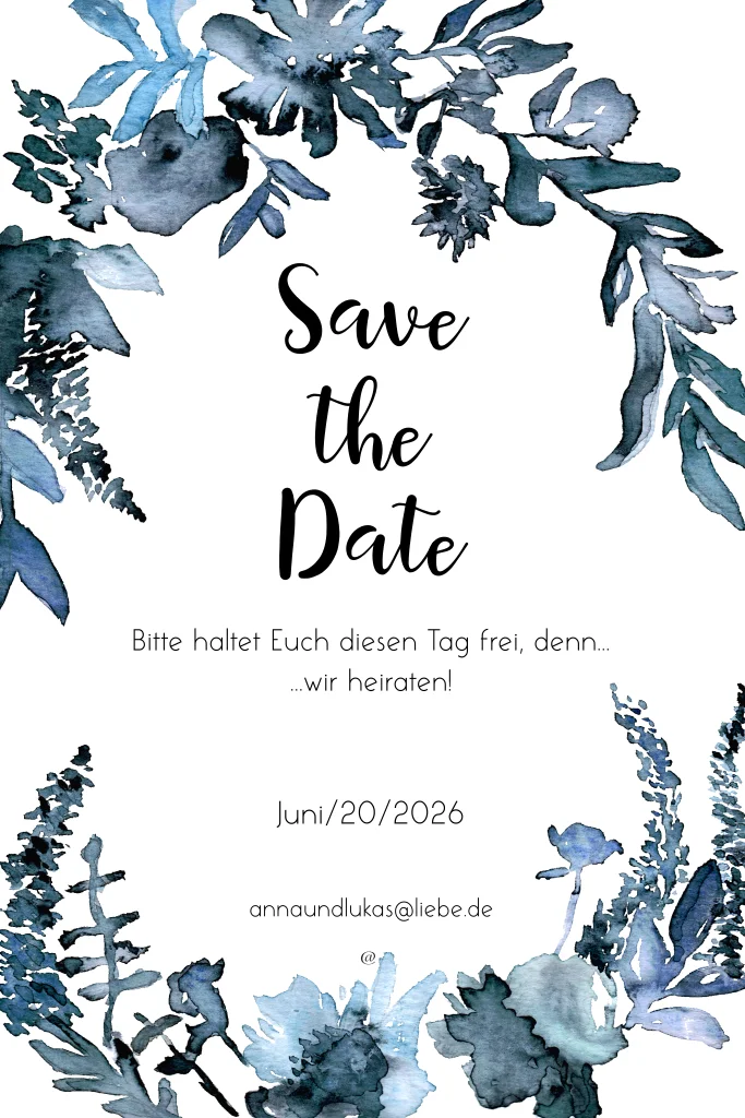 Diese Save-the-Date Karte mit klassischen Aquarellblumen in kühlem Blau ist eine stilvolle Karte für zeitlose Hochzeitsmomente.