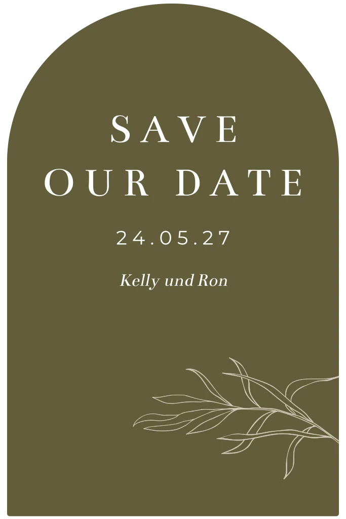 Diese elegante Save-the-Date Karte in einem olivgrünen Bogendesign eignet sich perfekt für Eure Hochzeit.