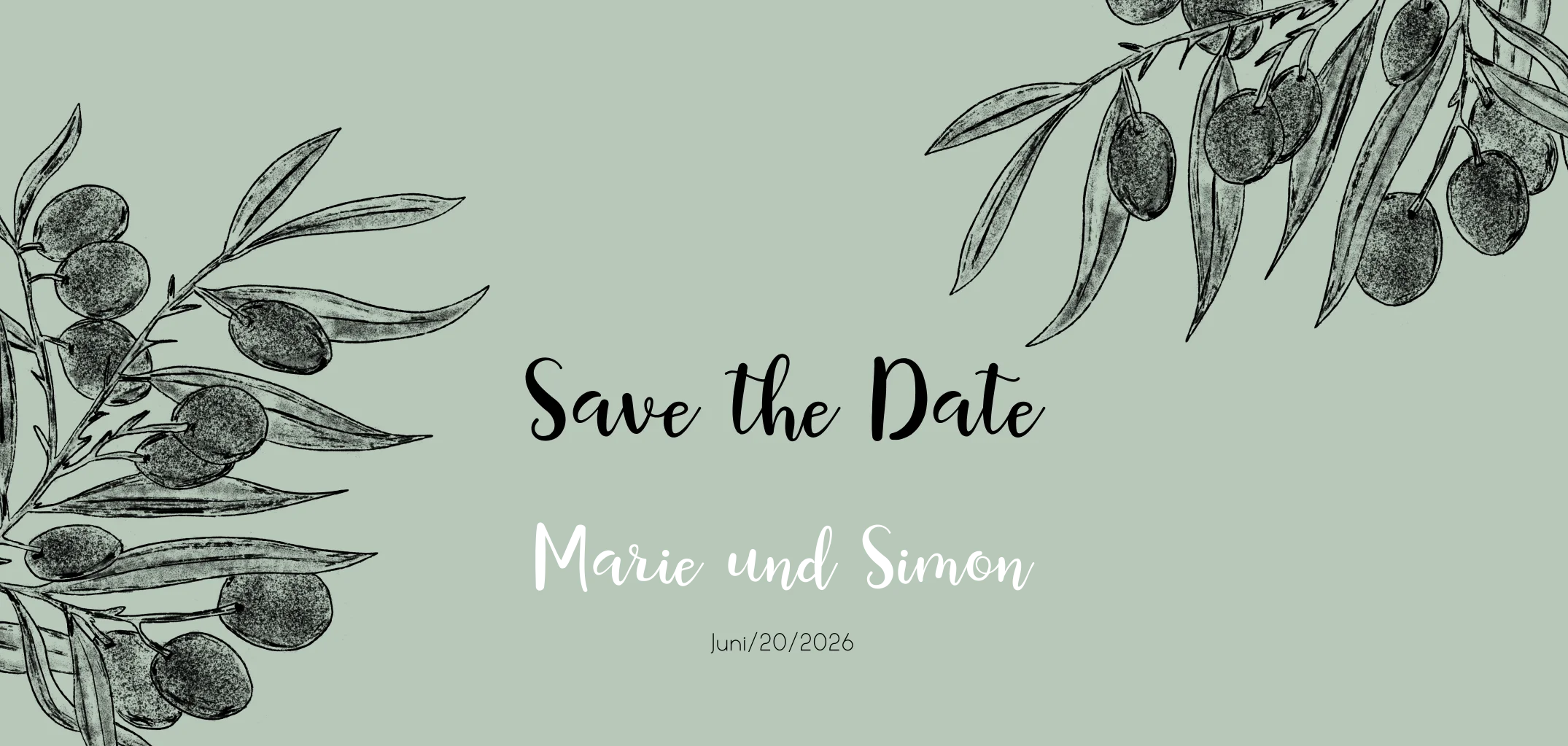 Eine elegante Save-the-Date Karte mit Olivenzweigen in schlichtem Design. Die Karte versprüht eine natürliche, mediterrane Leichtigkeit und zeitlose Schönheit.