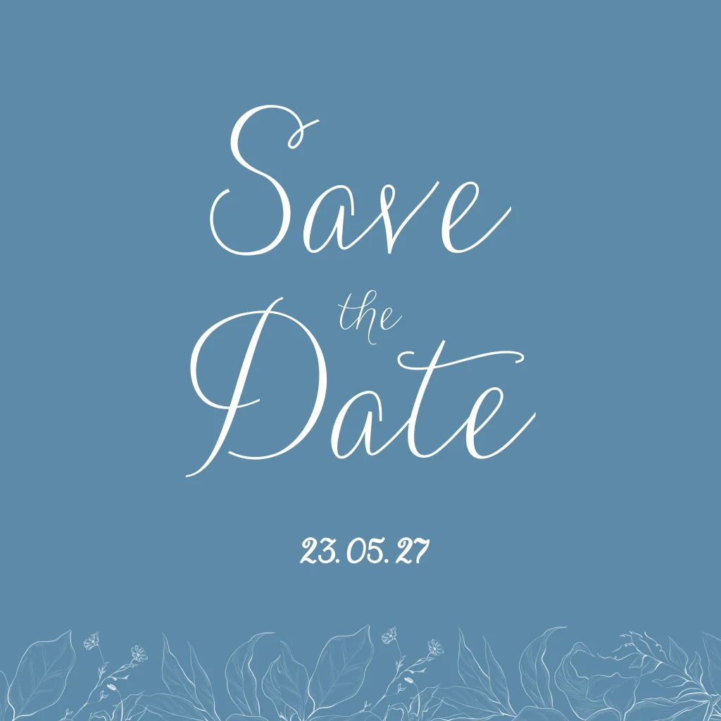 Eine wunderschöne blaue Save-the-Date Karte mit sanften weißen Blumen.