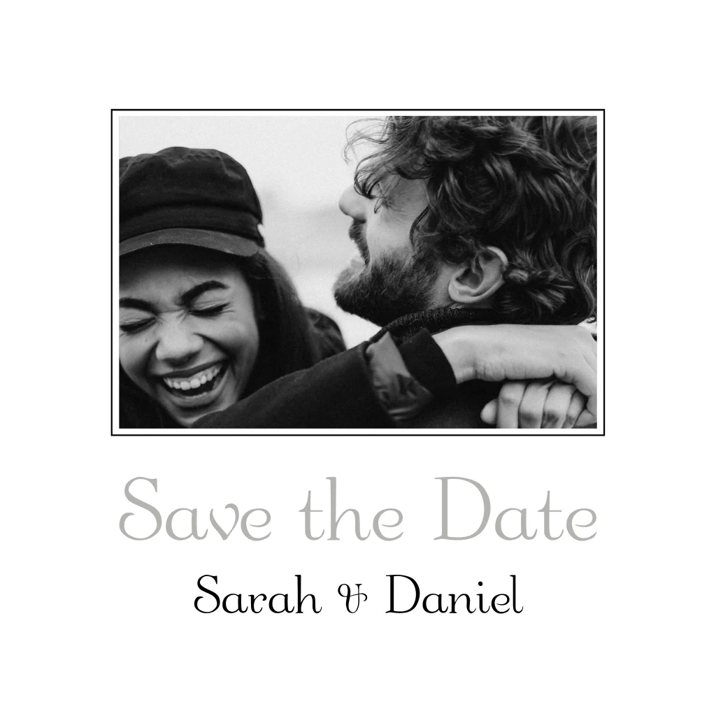 Zeitlose Save-the-Date Karte zur Hochzeit mit einem Schwarz-Weiß-Foto im Rahmen und silberner Schrift.