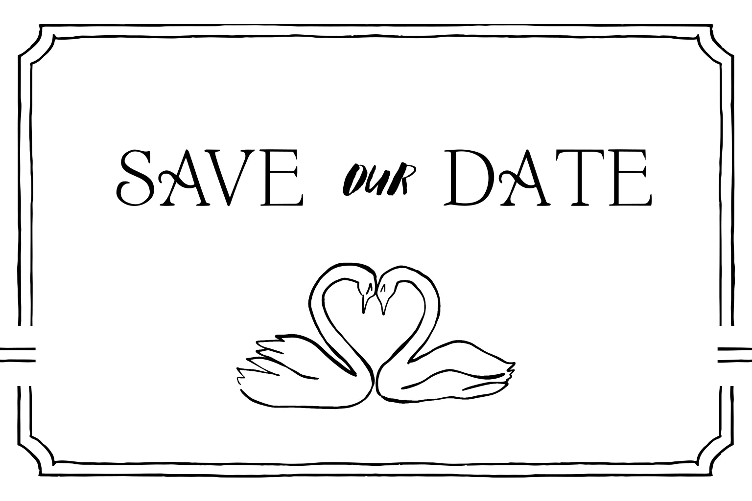 Eine schlichte, schwarz-weiße Vintage-Save-the-Date Karte mit zwei Schwänen und einem gezeichneten Rahmen.