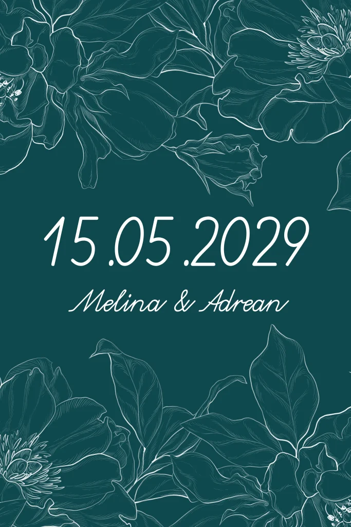 Eine elegante Save-the-Date Karte in dunkelgrün mit zarten gezeichneten Blumen.