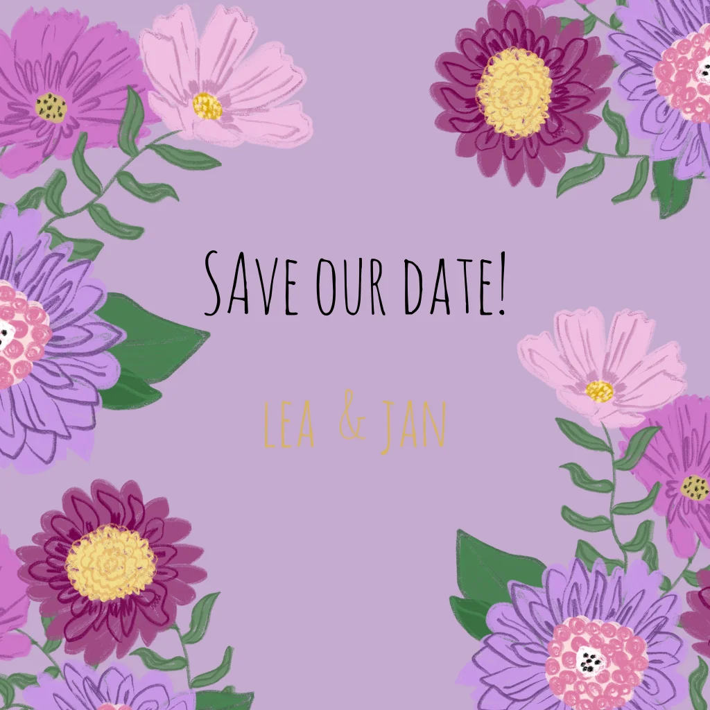 Farbenfrohe Save-the-Date Karte. Diese Karte mit kräftigen Blüten soll ein fröhliches Statement setzen für eine unvergessliche Hochzeit.