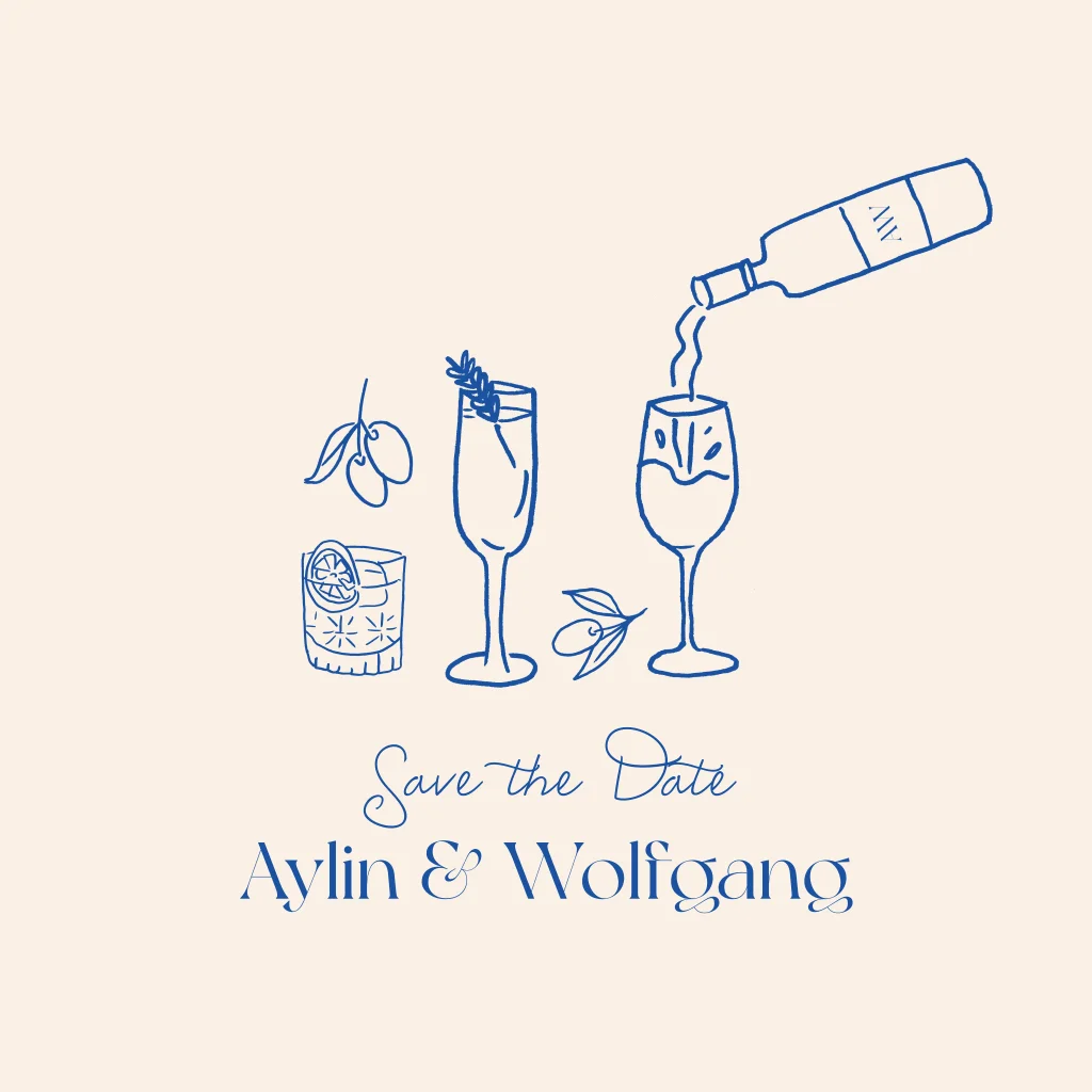 Stilvolle Save-the-Date Karte, um Eure Gäste zu Eurer Hochzeit einzuladen. Angesagte Save-the-Date Karte mit blauen Zeichnungen von Gläsern und Oliven.